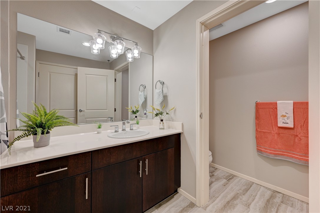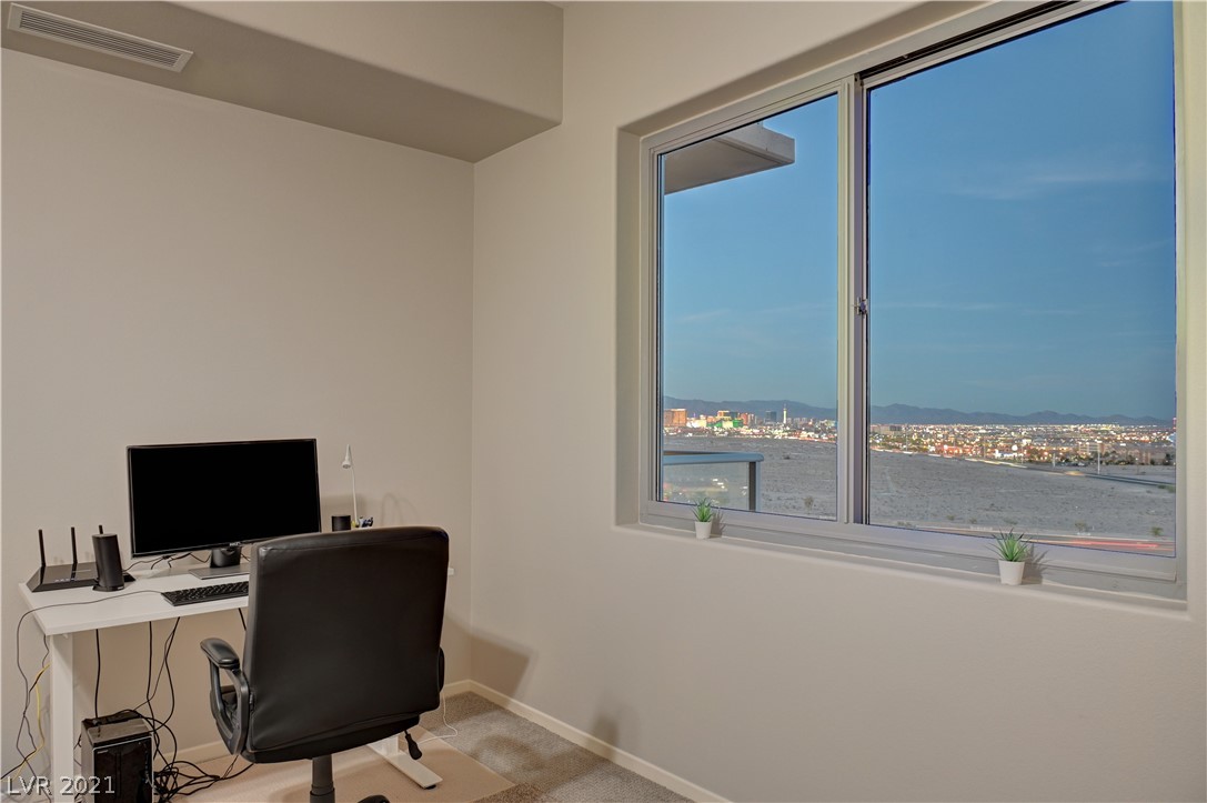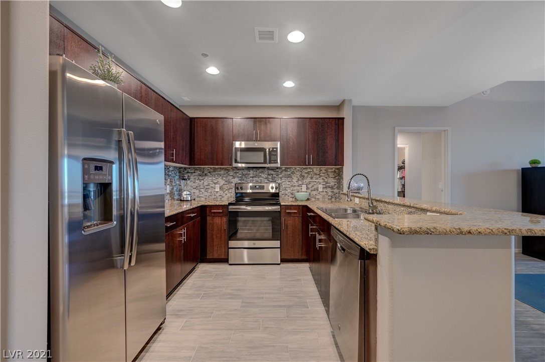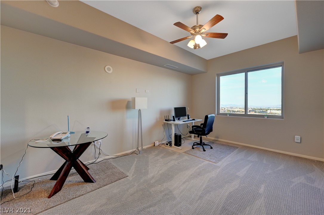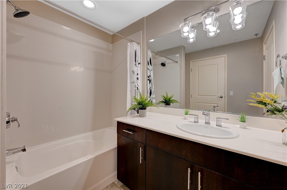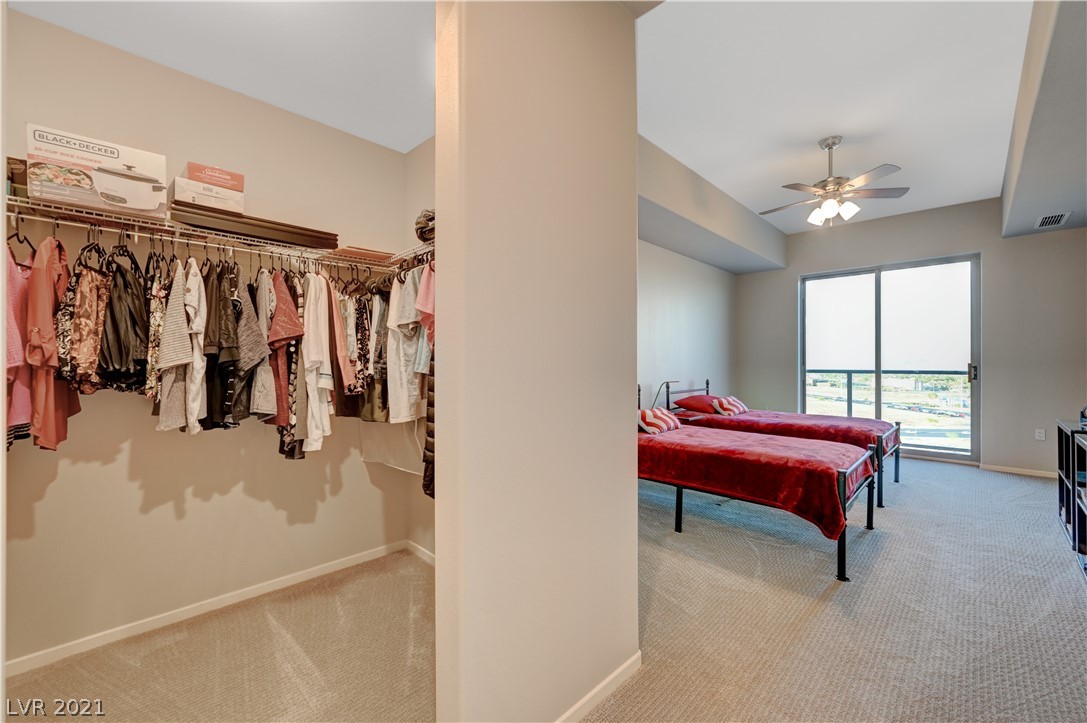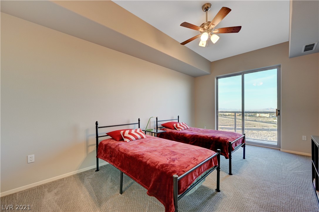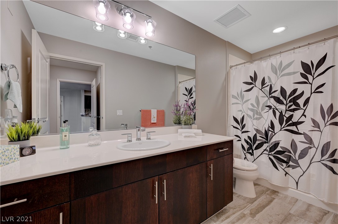 Take in breathtaking Strip views from this gorgeous 2 bedroom / 2 bathroom condo! 2 primary suites with ensuite bathrooms and huge walk-in closets. 2nd bedroom is perfect for a home office! Dual access to large balcony from primary suite and great room. Kitchen features granite countertops with breakfast bar, GE stainless steel appliances. Beautiful grey wood look tile in great room and kitchen, very easy to keep clean. Private storage unit included. Conveniently located on the South Strip. Only minutes from Allegiant Stadium, McCarran Airport, I-15, grocery store, pharmacy, and more. Monthly HOA dues include cable, internet, concierge, all amenities, and more! 24 hour amenities, 2 story fitness center, resort pool, media room, on-site dry cleaning services through Mint Locker, business center with conference room, controlled building access, 2 dog parks, and much more! VA and Fannie Mae approved.